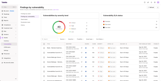 In Vanta, you’ll find the synced vulnerabilities under Assets → Vulnerabilities: