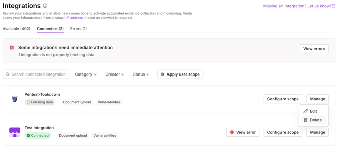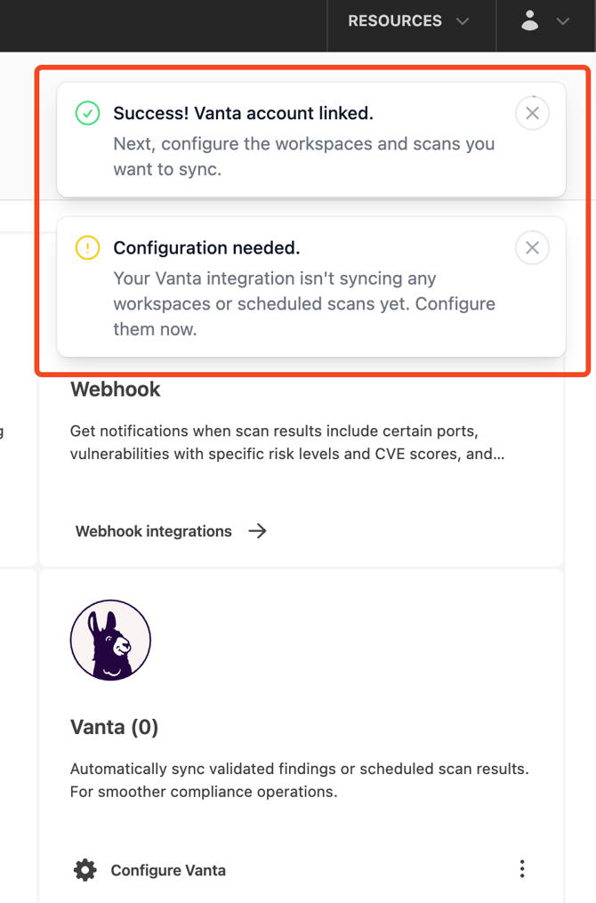 However, in case you were already using the Vanta integration to sync the scan results of scheduled scans prior to October 1st, 2025, in order to get the new "syncing vulnerabilities of desired workspaces" functionality up and running, you'll need to update your existing integration.
